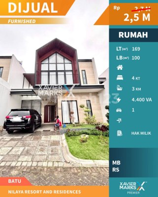 DIJUAL CEPAT RUMAH DAN VILLA DI NILAYA RESORT & RESIDENCE BATU Luas Tanah 169m2 Luas Bangunan 100m2 Full furnish/kosongan Kamar tidur 4 Kamar mandi 3 Kolam renang Kitchen set Carport Air PDAM Daya listrik 4400 VA Ada water heater Ada jogging track umum View gunung panderman, lake & city cantik One gate system Pos security 24 jam Cocok untuk dijadikan villa & disewakan Lokasi strategis : 2 menit ke Jatimpark 2 2 menit ke BNS 5 menit ke Jatimpark 1 6 menit ke Lippo Plaza Batu 8 menit ke Museum Angkut 9 menit ke Alun-alun Kota Batu 25 menit ke Malang kota, ke exit tol Singosari Harga 2,5 M NEGO More Details Viewing Appointment : Ian Abrianto Xavier Marks Premier