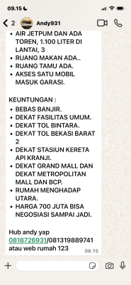 Pln 1300 , jetpum, toren air 1100 ltr, tingkat 2.5 lantai, ada garasi , dekat pintu tol bintara dan stasiun ka bekasi, bebas banjir