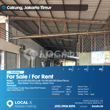 Lokasi Strategis Di Jalan Raya, Dekat RSUP Persahabatan, Dekat Akses Tol For Sale / For Rent - Jual / Sewa Gudang Raya Bekasi Timur Cakung, Jakarta Timur Harga. Rp 40,000,000,000 (Jual) / Rp 900,000,000 (Sewa/Tahun) Deskripsi Properti. Lokasi Strategis Di Jalan Raya, Dekat RSUP Persahabatan, Dekat Akses Tol Luas Tanah. 1700 m2 Dimensi. 28x60 Luas Bangunan. 300 m2 Sertipikat. HGB Kamar Tidur. - Kamar Mandi. - Garasi Mobil. - Hadap / View. Barat LOCAL X Kelapa Gading ******** ⓪②① ②⑨⓪⑥ ⑧⑤⑨⑤ Whatsapp/Call. Mariana - ⓪⑧①⑥④⑧③⓪⑤⑤⓪ P3KPG-0000xxxx-MT-J/S