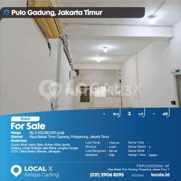 Cocok Untuk Usaha, Bank, Kuliner, Klinik, Apotik, Gudang, Lokasi Strategis Jalan Besar, Lengkap Dengan CCTV, Dekat Stasiun Klender, Jatinegara For Sale - Jual Ruko Raya Bekasi Timur Cipinang, Pulogadung, Jakarta Timur Harga. Rp 3,450,000,000 (Jual) Deskripsi Properti. Cocok Untuk Usaha, Bank, Kuliner, Klinik, Apotik, Gudang, Lokasi Strategis Jalan Besar, Lengkap Dengan CCTV, Dekat Stasiun Klender, Jatinegara Luas Tanah. 118.8 m2 Dimensi. 4.4x27 Luas Bangunan. 350 m2 Sertipikat. HGB Kamar Tidur. - Kamar Mandi. 3 Garasi Mobil. - Hadap / View. Selatan LOCAL X Kelapa Gading ******** ⓪②① ②⑨⓪⑥ ⑧⑤⑨⑤ Whatsapp/Call. Mariana - ⓪⑧①⑥④⑧③⓪⑤⑤⓪ P3KPG-0000xxxx-MT-J
