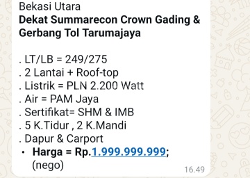 Luas tanah 249 Luas bangunan 275 SHM kamar 5 kmd 2 Ada Dapur Ada Carport halaman belakang masih luas harga 1.999.999.xxx,- harga lama harga baru 1.85M nego di Taruma Jaya Bekasi Utara