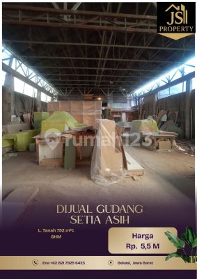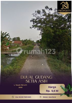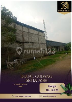 DIJUAL GUDANG 1 Lantai di - Setia Asih, Bekasi-Jawa Barat Luas Tanah 752 m² Dimensi 11,5 x 65,39m² Luas Bangunan 745 m² 1 Lantai UnFurnish Listrik 13.000 Watt Air Sumur Sertifikat SHM Hadap Timur Hal yang Menarik : Dekat dengan Summarecon Crown Note. Hanya Truk engkel Harga 5,5 M Nego