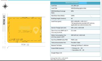 DIJUAL TANAH INDUSTRI LUAS : 31.386m² DI KAWASAN INDUSTRI MM2100 - BEKASI Lokasi : Kawasan Industri MM 2100, Cikarang Barat, Bekasi, Jawa Barat Spec : • Dalam Kawasan Industri MM2100 • Luas Tanah : 31.386 m² (3,1 Ha) • Dimensi : ± Lebar ; 134 m x Panjang ; 188 m • Bentuk Tanah : Persegi • Sertifikat : Hak Guna Bangunan (SHGB ) • Ijin Industri • KLB : 60 % • KDB : 240 % • Ketinggian Bangun : 40 meter • Akses Container : 40 Feet • Row Jalan : 40 meter & 22 meter • Lokasi Strategis . *co.her.3.25 .