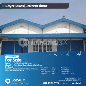 Siap Pakai, Lokasi Strategis Di Jalan Utama, Dekat Kecamatan Cakung, Dekat Akses Tol For Sale - Jual Gudang Raya Bekasi Cakung Barat, Jakarta Timur Harga. Rp 9000000xxxxJual) Deskripsi Properti. Siap Pakai, Lokasi Strategis Di Jalan Utama, Dekat Kecamatan Cakung, Dekat Akses Tol Luas Tanah. 2750 m2 Dimensi. 30x90 Luas Bangunan. 1500 m2 Sertipikat. SHM Kamar Tidur. - Kamar Mandi. - Garasi Mobil. - Hadap / View. Barat LOCAL X Kelapa Gading ******** ⓪②① ②⑨⓪⑥ ⑧⑤⑨⑤ Whatsapp/Call. Mariana - ⓪⑧①⑥④⑧③⓪⑤⑤⓪ P3KPG-0000xxxx-MT-J