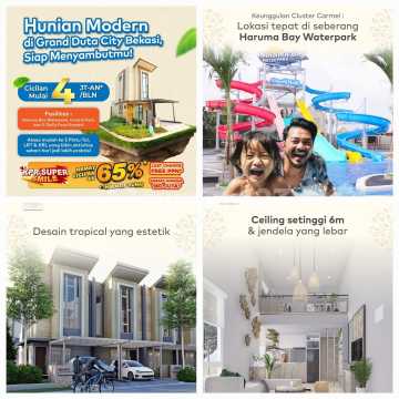 Grand Duta City Bekasi menawarkan berbagai fasilitas yang lengkap dan modern, membuat hidup Anda lebih nyaman dan praktis. Berikut beberapa fasilitas yang tersedia: - *Fasilitas Umum*: - Central Park - Club House - Mall - Water Park - Education - *Fasilitas Olahraga*: - Jogging track - Area terbuka hijau - *Fasilitas Keamanan*: - Sistem keamanan 24 jam - CCTV - Akses masuk yang terkontrol - *Fasilitas Pendidikan*: - Al Azhar Bekasi - BPK Penabur Bekasi - Universitas Bina Nusantara Bekasi - Universitas Esa Unggul Bekasi - *Fasilitas Transportasi*: - Akses tol Bekasi Barat, Cakung Timur, Tarumajaya, dan Gabus - Stasiun LRT koridor Bekasi Barat dan Kelapa Gading - Stasiun KRL Bekasi dan Kranji - Terminal Bis Pulogadung - Koridor Trans Jakarta dari Harapan Indah Dengan fasilitas-fasilitas tersebut, Grand Duta City Bekasi menjadi pilihan yang ideal untuk tinggal dan beraktivitas ¹ ².