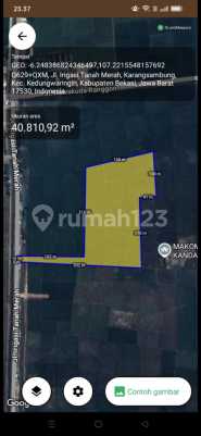 Tanah Lokasi Karang Sambung kec. Kedungwaringin Bekasi Jawa Barat Luas total lahan 40.810,92m2 Konsumen perumahan sudah ada dari PT. Granito dan PT. Multiverse sebanyak 500 Unit. Zona Kuning : Aman✅ LSD ❌ : Aman ✅ Harga : 300rb/m (Nego) (TM)