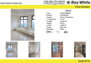 Kesempatan terbatas buat Anda dapatkan apartemen nyaman dengan return investasi tinggi di Cikarang Barat, Bekasi. Apartemen ini menawarkan lokasi yang strategis serta memiliki jumlah lantai 25 yang siap untuk segera Anda miliki, utamanya bagi Anda yang mencari hunian di lokasi yang dekat dengan fasilitas umum. Kondisi properti ini bagus dengan detail properti sebagai berikut: - Kamar Tidur: 2 - Kamar Mandi: 1 - Sertifikat: Hak Milik Satuan Rumah Susun - Daya Listrik: 2200 watt - Kondisi Perabotan: Unfurnished Tersedia berbagai fasilitas lengkap, seperti: - Kolam Renang. - Taman. - Tempat Jemuran. - Kolam Renang. Tidak hanya itu, namun properti ini juga memiliki keunggulan sebagai berikut: - Bisa KPR. - Bebas Banjir. - Dekat Pusat Perbelanjaan. - Dekat Akses Tol. - Dekat Landmark. Lokasi Strategis terletak di Cikarang Barat, properti ini memudahkan akses Anda ke fasilitas-fasilitas utama dan unggulan Harga yang sangat kompetitif yaitu, Rp. 650.000.xxx, apartemen ini siap menjadi milik Anda! Nikmati segala kemudahan dan berbagai keunggulan menarik saat properti berkualitas ini milik Anda. Hubungi segera dan dapatkan informasinya ataupun cek unit!