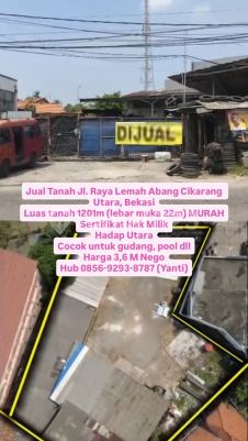 Jual Tanah Jl. Raya Lemah Abang Cikarang Utara, Bekasi Luas tanah 1201m (lebar muka 22m) MURAH Sertifikat Hak Milik Hadap Utara Cocok untuk gudang, pool dll Harga 3,6 M Nego Hub 0856xxxxxxxxYanti)