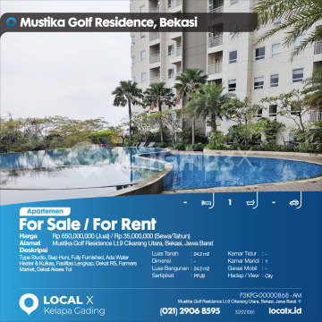 Type Studio, Siap Huni, Fully Furnished, Ada Water Heater & Kulkas, Fasilitas Lengkap, Dekat RS, Farmers Market, Dekat Akses Tol For Sale / For Rent - Jual / Sewa Apartemen Mustika Golf Residence Lt.9 Cikarang Utara, Bekasi, Jawa Barat Harga. Rp 65000xxxxJual) / Rp 3500xxxxSewa/Tahun) Deskripsi Properti. Type Studio, Siap Huni, Fully Furnished, Ada Water Heater & Kulkas, Fasilitas Lengkap, Dekat RS, Farmers Market, Dekat Akses Tol Luas Tanah. 24.2 m2 Dimensi. - Luas Bangunan. 24.2 m2 Sertipikat. PPJB Kamar Tidur. - Kamar Mandi. 1 Garasi Mobil. - Hadap / View. City LOCAL X Kelapa Gading ******** ⓪②① ②⑨⓪⑥ ⑧⑤⑨⑤ P3KPG-0000xxxx-AM-J/S