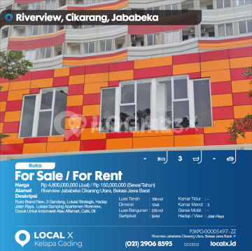 Ruko Brand New, 3 Gandeng, Lokasi Strategis, Hadap Jalan Raya, Lokasi Samping Apartemen Riverview, Cocok Untuk Indomaret Atau Alfamart, Café, Dll For Sale / For Rent - Jual / Sewa Ruko Riverview Jababeka Cikarang Utara, Bekasi Jawa Barat Harga. Rp 480000xxxxJual) / Rp 15000xxxxSewa/Tahun) Deskripsi Properti. Ruko Brand New, 3 Gandeng, Lokasi Strategis, Hadap Jalan Raya, Lokasi Samping Apartemen Riverview, Cocok Untuk Indomaret Atau Alfamart, Café, Dll Luas Tanah. 108 m2 Dimensi. 12x9 Luas Bangunan. 228 m2 Sertipikat. SHM Kamar Tidur. - Kamar Mandi. 3 Garasi Mobil. - Hadap / View. Jalan Raya LOCAL X Kelapa Gading ******** ⓪②① ②⑨⓪⑥ ⑧⑤⑨⑤ P3KPG-0000xxxx-ZZ-J/S