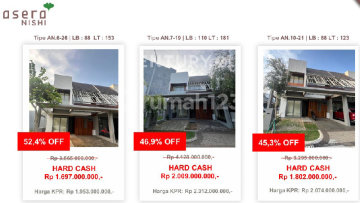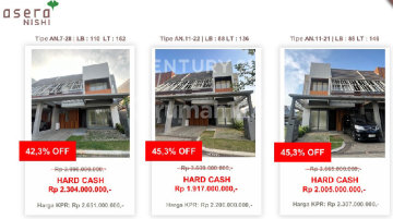 Super Promo! Turun Harga Lebih dari Setengah! Kini saatnya memiliki rumah mewah di Cluster Asera Nishi, kawasan hunian modern nan eksklusif di Kota Harapan Indah, Bekasi. Dikembangkan oleh Damai Putra Group, Asera Nishi dirancang untuk menghadirkan gaya hidup modern, nyaman, dan berkelas dengan lingkungan hijau, aman, dan akses strategis. Unit terbatas! Dengan diskon fantastis hingga 52,4%, Anda bisa memiliki hunian premium di lokasi yang nilai investasinya terus melesat setiap tahun. Spesifikasi Rumah (Contoh Tipe 2 Lantai): Luas Tanah: ± 105 m² Luas Bangunan: ± 90–120 m² Kamar Tidur: 3 Kamar Mandi: 2 Ruang Tamu dan Ruang Keluarga lega Dapur modern Balkon luas Carport 1–2 mobil Listrik: 2.200–3.500 Watt Air Bersih: PAM Struktur beton bertulang, finishing premium Desain arsitektur modern Jepang minimalis Jalan lingkungan lebar & one gate system (keamanan 24 jam) Fasilitas Lengkap di Sekitar Cluster Asera Nishi – Kota Harapan Indah: Pusat Belanja & Komersial: Harapan Indah Boulevard The Plaza Harapan Indah Mega Office Park Lotte Mart & Carrefour Pasar Modern Harapan Indah Sekolah & Pendidikan: Sekolah Al Azhar, BPK Penabur, IPEKA, Bunda Hati Kudus Global Prestasi School #250484