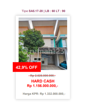 Rekomendasi properti dengan penawaran terbaikRumah123 adalah situs teknologi jual beli dan sewa properti terdepan di Indonesia, yang hadir sejak tahun 2007 dan telah melayani jutaan orang di Indonesia. Rumah123 senantiasa berkomitmen untuk membuat pengalaman 'Jual Beli dan Sewa Properti Lebih Mudah' dengan dukungan dari developer terkemuka serta agen profesional.