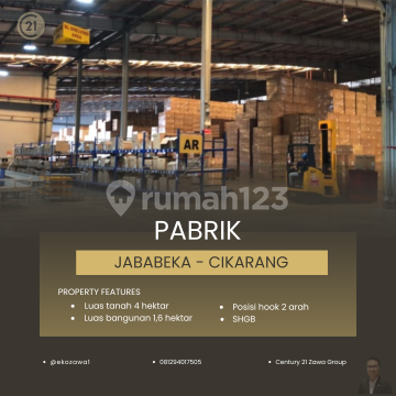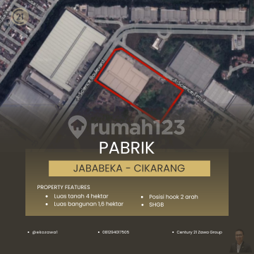 DIJUAL PABRIK Di JABABEKA, Cikarang Lokasi : Cikarang - Jawa Barat Spec : - Luas Tanah 40.000 m² | 4 Ha - Luas Bangunan 16.000 m² | 1,6 Ha - SHGB sd 2044 - Listrik : 400 Kva - Tinggi Atap : 13 Meter - Air : WTP ( Jababeka ) - Security : 24 Jam - Akses : 40 Feet - Kekuatan lantai : 4.5 Ton / m² - Loading Dock Price 6,25 Juta / m² - Exc PPN ( Negotiable ) KHUSUS PEMBELI SERIUS silakan hubungi: Eko Pakpahan 0812xxxxxxxx Century21 Zawa PIK #gudangforsale #pabrikforsale #gudangpabrikforsale #gudangdijual #pabrikdijual #tanahforsale #tanahdijual