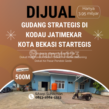 Gudang Di Jual Cepat Siap Pakai Cocok Utk Produksi , & Gudang Frozen Food Di Kodau Jatimekar (*#ninggmpNibks*#) Spesifikasi : Dinding : hebel Lantai : keramik Luas Tanah : 500M2 Luas Bangunan : 235M2 Dimensi Lebar : 17M Panjang 28M Kamar Tidur : 1 Kamar Mandi : 2 Lantai : 1 Carport : 10 Mobil Orientasi : Utara Bangunan Tahun : 2016 Listrik : 19.600 AC : 3 Mushola : ada legalitas: SHM IMB Jetpump Selling Point : Bebas banjir Dekat Toll Jatiwarna Dekat Mall Pondok Gede Dekat Ke Ratna Jatibening Dekat Ke Pasar Pondok Gede Harga : 3,95M nego Paminat serius hubungi: S. Asep Suherman Tlp/WA/telegram : 0853xxxxxxxx
