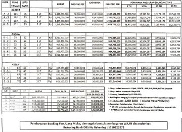 Dijual Rumah Indent Dalam Cluster di Jalan Ratna Jatibening Pondok Gede Bekasi Spesifikasi : - SHM sudah Pecah Type Azalea 2 Lantai LT. 101 M² ( 6 x 17 ) LB. 95 M² Indent 7 Bulan Harga Mulai Rp.1.440.600.xxx,- Type Asoka 1 Lantai LT. 75 M² ( 6 x 12,5 ) LB. 52 M² Indent 4 Bulan Harga Mulai Rp. 953.400.xxx,- Type Aster 1 Lantai LT. 62 M² ( 5 x 12,5 ) LB. 45 M² Indent 4 Bulan Harga Mulai Rp. 805.350.xxx,- Kavling LT. 101 M², 102 M²,111 M², 156 M² Harga Mulai Rp. 845.300.xxx,- Cara Bayar : - Cash Keras - Cash bertahap ( max 1 Tahun ) - KPR Booking Fee Rp. 10 juta DP. 30 % Harga sudah termasuk : - Rumah Pajak Pembeli (BPHTB),AJB,BN, Listrik dan Air. - Kavling Pajak Pembeli (BPHTB),AJB,BN.
