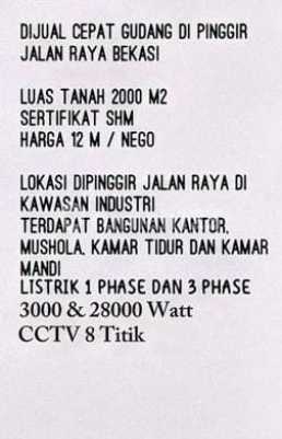 Luas lahan 2000 meter Bangunan kurang lebih 700 meter Akses jln kontener Lokasi Bekasi padurenan Harga 12 Milyar nego Harga pasaran 17M