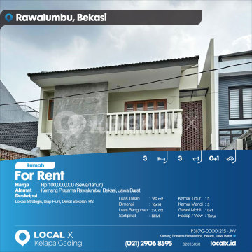 Lokasi Strategis, Siap Huni, Dekat Sekolah, RS For Rent - Sewa Rumah Kemang Pratama Rawalumbu, Bekasi, Jawa Barat Harga. Rp 10000xxxxSewa/Tahun) Deskripsi Properti. Lokasi Strategis, Siap Huni, Dekat Sekolah, RS Luas Tanah. 162 m2 Dimensi. 10x16 Luas Bangunan. 270 m2 Sertipikat. SHM Kamar Tidur. 3 Kamar Mandi. 3 Garasi Mobil. 0+1 Hadap / View. Timur LOCAL X Kelapa Gading ******** ⓪②① ②⑨⓪⑥ ⑧⑤⑨⑤ P3KPG-0000xxxx-JW-S