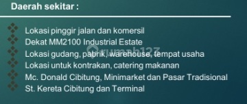 Gudang di Setu, Bekasi. Dijual di wilayah yang nyaman. Dengan kategorinya adalah sebagai berikut: - Kamar Mandi: 3 - Sertifikat: SHM - Sertifikat Hak Milik - Kondisi Perabotan: Unfurnished Dan properti ini juga terdepan karena: - Siap Huni. - Bebas Banjir. Lokasi gudang berikut dekat fasilitas umum, hanya selangkah menuju berbagai fasilitas utama dan menarik. Hanya Rp. 3.000.000.xxx, anda dapat langsung dapatkan gudang eksklusif di daerah Setu ini.