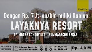 Rasakan Tinggal Nyaman Seperti di Resort setiap hari hanya di Primrose Condovilla Summarecon Bekasi - Type: 2+1BR - KT: 2+1 KM: 2+1 - Luas Semi Gross: 79,32 m2 - Luas Nett: 72,5 m2 - Balkon - Garasi - Listrik: 2200 Watt - Air: WTP Summarecon Fasilitas Lengkap: - Kolam Renang - Jogging Track - Danau - PLayground - Lap Basket - Ruang Bersantai Outdoor untuk piknik keluarga - Gym