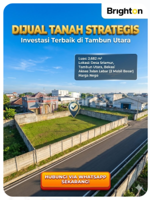 Dijual sebidang tanah dengan luas total 2.682 meter persegi. Berada di pinggir jalan besar, bisa buat simpangan 2 mobil besar. Lokasi berada di Desa Sriamur, Tambun Utara, Kab. Bekasi. Harga nego. Ingin info detail tanah, hubungi agen via Whatsapp yang tersedia.