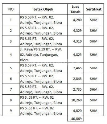 Dijual Tanah Lokasi Tanah di Desa Adirejo, Tunjungan - Blora Total Luas Tanah yg mau dijual 40869 m2 - Luas Tanah area Kantor : 7290 m2 - Luas Tanah area sawah: 33579 m2 Harga Jual - Kalo sama Kantor & Gudang 1,5jt/m2 - Kalo 1,1jt/m2 Gudang dibongkar (tanpa gudang) Dani Lai GadingPro Pluit 0899889xxxx