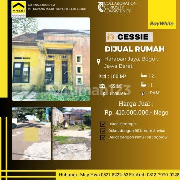 Dijual 1 Unit Rumah di dalam Perumahan,berlokasi di Harapan Jaya,Bogor Jawa Barat. Lokasi strategis,dekat dengan RS.Umum Annisa Dekat Pintu tol Jagorawi Luas Tanah 100m2 Luas bangunan 55m2 Info Hubungi: 08218222xxxx Meyhwa