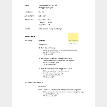 Luas Lahan: 3,4 ha Jumlah Persil: 21 Persil Status Persil: -10 Persil SHM -1 Persil SHGB -10 Persil AJB Pemilik: Atas nama 5 orang (1 Keluarga)