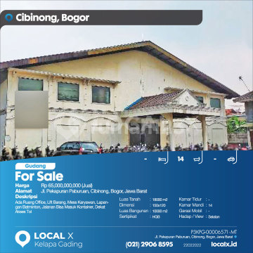 Ada Ruang Office, Lift Barang, Mess Karyawan, Lapangan Batminton, Jalanan Bisa Masuk Kontainer, Dekat Akses Tol For Sale - Jual Gudang Pekapuran Paburuan, Cibinong, Bogor, Jawa Barat Harga. Rp 65,000,000,000 (Jual) Deskripsi Properti. Ada Ruang Office, Lift Barang, Mess Karyawan, Lapangan Batminton, Jalanan Bisa Masuk Kontainer, Dekat Akses Tol Luas Tanah. 18000 m2 Dimensi. 150x120 Luas Bangunan. 10000 m2 Sertipikat. HGB Kamar Tidur. - Kamar Mandi. 14 Garasi Mobil. - Hadap / View. Selatan LOCAL X Kelapa Gading ******** ⓪②① ②⑨⓪⑥ ⑧⑤⑨⑤ Whatsapp/Call. Mariana - ⓪⑧①⑥④⑧③⓪⑤⑤⓪ P3KPG-0000xxxx-MT-J