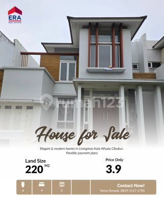 ADJUST HARGA DIJUAL RUMAH CLUSTER LIVINGSTON KOTA WISATA CIBUBUR LT 220 m² LB 201 m² KT 3+1 KM 3+1 Listrik 2.200 watt token SHM on Hand Hadap Timur Garasi 1 mobil Carport 1 mobil KUNCI READY Harga 4 M Turun Jd 3,7M (nego sampai jadi) yenn* kum