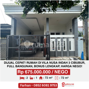 Rumah Siap Huni SHM di Vila Nusa Indah 3, Cibubur Kesempatan memiliki rumah full bangunan di kawasan strategis Vila Nusa Indah 3, sangat dekat dengan Kota Wisata Cibubur. Cocok untuk hunian keluarga maupun investasi jangka panjang. Rumah ini dibangun dengan material berkualitas: Luas tanah 72 m² (full bangunan) 2 Kamar Tidur, 1 Kamar Mandi Struktur full baja ringan Pintu & jendela aluminium (tahan lama & minim perawatan) Lantai granit Carport Listrik 2200 watt Sertifikat SHM Bebas banjir Lingkungan aman & nyaman Bonus menarik siap pakai: Kitchen set dapur aluminium full set Rak atas mesin cuci aluminium Lemari pakaian aluminium Rak sapu & pel aluminium Harga: 675 Juta (Nego) Unit siap huni, bonus lengkap, lokasi strategis - jarang ada di harga ini. Farhan - O852-6O8-xxx-53 Serius buyer, silakan hubungi sekarang sebelum terjual!