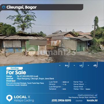 (Rp2,5Jt/m2)Lokasi Strategis, Tanah Padat Siap Pakai, Peruntukan Industri, Sertipikat For Sale - Jual Tanah Kavling Raya Narogong, Cileungsi, Bogor, Jawa Barat Harga. Rp 9750000xxxxJual) Deskripsi Properti. (Rp2,5Jt/m2)Lokasi Strategis, Tanah Padat Siap Pakai, Peruntukan Industri, Sertipikat Luas Tanah. 39000 m2 Dimensi. 11.78 Luas Bangunan. 39000 m2 Sertipikat. SHM Kamar Tidur. - Kamar Mandi. - Garasi Mobil. - Hadap / View. Selatan LOCAL X Kelapa Gading ******** ⓪②① ②⑨⓪⑥ ⑧⑤⑨⑤ Whatsapp/Call. Mariana - ⓪⑧①⑥④⑧③⓪⑤⑤⓪ P3KPG-0000xxxx-MT-J