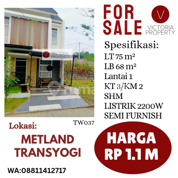 Dijual Rumah Metland Transyogi Luas Tanah : 75 Luas bangunan : 68 2 lantai Kamar Tidur : 3 Kamar Mandi : 2 Air suur bor bisa di masak Sertifikat : SHM Daya Listrik : 2200 Furnish FREE ( AC,Mj Makan, Mesin Cuci, Dipan & Kasur, Lemari baju jati, meja belajar ) Harga jual : 1,1 M (Nego) Bebas Banjir Info tambahan : One gate sistem Hadap rumah : Barat Lebar jalan : 6m Fasilitas sekitar rumah • Samping kanan Musollah • 3menit RS Hermin • 2menit Metropolitan Mall • 10 menit Pintu Tol • Pasar Cileungsi • Sekolah Bina Mulya,Al Azhar Dll • Apartmen Kaliana • Diara Hotel TW037