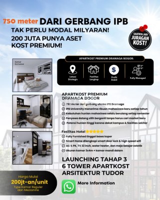 *Mau punya ASET Properti KOST tapi budget terbatas?* Yuk Mulai dari 200 Juta-an saja di Project Apartemen Kost Dramaga Bogor! *Di Apartkost Dramaga ini, Modal 200 Jt-an untuk 1 Unit Kamar Kost Produktif (Full Furnished)* Kesempatan emas bagi Anda yang ingin mulai memiliki aset produktif di lokasi emas. Lokasi Strategis, 750m dari Kampus IPB Dramaga Bogor Kamar Premium, sudah Full Furnished Siap Huni Potensi Tinggi: Kawasan pendidikan dengan okupansi tinggi *Terletak dalam Kawasan Aktif dengan dengan fasilitas :* - Laundry - Resto & Cafe - Alfamart - Taman Hijau - Lahan Parkir *Furniture Kamar :* - Tempat Tidur & Kasur - Bantal - Lemari Buku - Air Conditioner (AC) 1/2 PK - Lemari Pakaian - Smart Door Lock - Gordyn - Meja dan Kursi Belajar - TV 32 Inch + Credenza (Rak TV) - Kamar Mandi (Wastafel, Shower, WC Duduk, Water Heater) *Harga belum termasuk :* 1. Pajak PPh Penjual, ditanggung Penjual 2. Pajak BPHTB, ditanggung Pembeli 3. Biaya Notaris utk AJB/Balik Nama *TAHUN AJARAN MAHASISWA BARU 2026 SEGERA DATANG!* *Amankan Unit Anda MULAI dari Sekarang!* *dan Raih Passive Income setiap bulannya* Marhaban Ya Ramadhan... Dapatkan Promo Special Ramadhan 1447, Cashback THR Lebaran & Subsidi BBM Mudik..