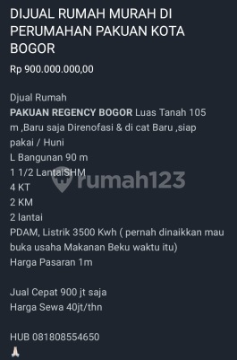 DIJUAL / DISEWAKAN RUMAH Di Perumahan Pakuan Regency Lokasi Strategis Ramai dpn Mall - kamar tidur 3 dibawah 1 diatas - kamar mandi 2 - listrik 2500 watt - Lantai 2 View Pegunungan - carport garasi Bisa 2 mobil - lingkungan Aman 24 jam nonstop - dekat terminal bubulak ,tol dll - tersedia lap basket,badminton dll - Harga Jual Rp.900jt - Harga Sewa Rp.55jt + Furnished - Harga sewa Rp 45jt No Furnished - Hub : 08180855xxxx Terimakasih.:pray: