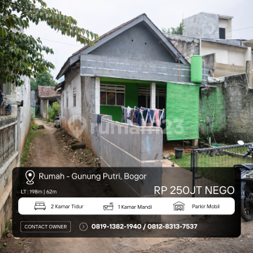 DIJUAL: RUMAH TANAH JUMBO 198m² HARGA 200 JUTAAN - GUNUNG PUTRI, BOGOR Lokasi: Kp. Sanding, RT 002 / RW 004 Desa Bojong Nangka, Kec. Gunung Putri, Kab. Bogor Spesifikasi Properti: Luas Tanah: 198 m² (Sangat Luas & Lega!) Luas Bangunan: 62 m² Kamar Tidur: 2 Kamar Mandi: 1 Area Parkir: 1 Mobil (Halaman Masih Muat Banyak!) Legalitas: SHM (Sertifikat Hak Milik) - Aman & Siap Balik Nama! Keunggulan Lokasi & Potensi: Tanah Melimpah: Dengan lahan hampir 200 m², Anda punya keleluasaan luar biasa untuk renovasi, tambah bangunan, atau membuat taman/kebun pribadi yang asri. Kawasan Strategis: Gunung Putri adalah kawasan berkembang yang dekat dengan akses Tol (Gunung Putri/Cimanggis) dan zona industri besar. Lingkungan Hidup: Kawasan yang sudah ramai pemukiman, dekat dengan sekolah, pasar, dan fasilitas publik di Bojong Nangka. Rekomendasi Unit: Family Haven: Sangat ideal untuk keluarga yang mencari rumah dengan halaman luas untuk area bermain anak tanpa harus keluar uang miliaran. Passive Income: Lokasi Gunung Putri selalu punya permintaan sewa yang tinggi. Sisa lahan yang luas sangat potensial dibangun 2-3 pintu kontrakan tambahan! Harga Jual: Rp 250.000.xxx (Nego Sampai Deal!) (Best Value: Miliki tanah 198m² di Gunung Putri dengan harga sangat kompetitif!) Info & Survey: 0819-1382-1xxx / 0812-8313-7xxx Kode Listing: GNP-1N4
