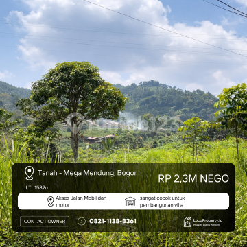 DIJUAL TANAH PREMIUM - AREA VILLA & WISATA MEGA MENDUNG, BOGOR Lokasi: Mega Mendung, Kabupaten Bogor, Jawa Barat (Kawasan Eksklusif & Berkembang - Banyak Villa Mewah) Spesifikasi Lahan: Luas Tanah: 1.582 m² Dimensi: ± 30 x 50 Meter (Kotak Proporsional) Legalitas: SHM (Sertifikat Hak Milik) - Aman & Siap Transaksi! Tipe Properti: Tanah Matang (Siap Bangun) Keunggulan Lokasi (High Demand Area): Neighboring Spots: Berada di area populer, dekat dengan Lentemland Camping Ground, The Hidden Hills, dan Amateur Youth Camp. Wisata & Pegunungan: Udara sejuk dengan view khas Puncak, sangat diminati oleh wisatawan Jakarta dan sekitarnya. Aksesibilitas: Lokasi strategis yang mudah dijangkau namun tetap memberikan privasi maksimal. Potensi Pengembangan Bisnis: Hospitality: Sangat ideal untuk pembangunan Villa Resort, Glamping Eksklusif, atau Camping Ground. Komersial: Lokasi punya traffic wisata yang bagus untuk Cafe atau Restaurant bertema alam. Investasi: Nilai tanah di Mega Mendung cenderung naik stabil, cocok untuk simpanan aset jangka panjang. Harga: Rp 230000xxxxNego) (Harga Investasi: Hanya kisaran 1,4 Jutaan/meter di Zona Puncak!) Info & Survey: 0821xxxxxxxx Kode Listing: MGM-5B2