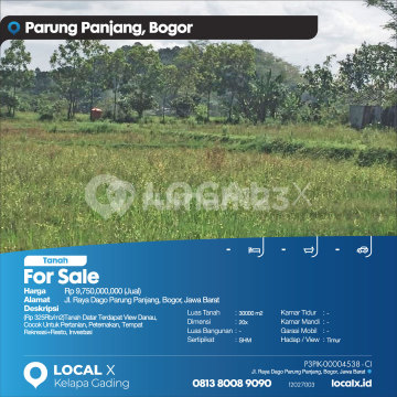 (Rp325rb/m2)Tanah Datar Terdapat View Danau, Cocok Untuk Pertanian, Peternakan, Tempat Rekreasi+Resto, Investasi For Sale - Jual Tanah Jl. Raya Dago Parung Panjang, Bogor, Jawa Barat Harga. Rp 9,750,000,000 (Jual) Deskripsi Properti. (Rp325rb/m2)Tanah Datar Terdapat View Danau, Cocok Untuk Pertanian, Peternakan, Tempat Rekreasi+Resto, Investasi Luas Tanah. 30000 m2 Dimensi. 20x Luas Bangunan. 30000 m2 Sertipikat. SHM Kamar Tidur. - Kamar Mandi. - Garasi Mobil. - Hadap / View. Timur LOCAL X Kelapa Gading ******** ⓪⑧①③⑧⓪⓪⑧⑨⓪⑨⓪ P3PIK-0000xxxx-CI-J
