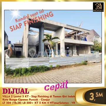DIJUAL VILLA 2 Lantai Pemandangan Sangat Bagus KT 5 - Siap Finishing di Taman Giri Indah Kota Bunga Cipanas Puncak - Cianjur Dekat Rumah Sakit dan Puncak Pas Luas Tanah 504 m² Dimensi 18 x 28 m Luas Bangunan diatas 500 m² 2 Lantai Kamar Tidur 4 Kamar pembantu 1 Kamar Mandi 3 + 1 Listrik 11.000 Watt Air Tanah Sertifikat SHM Hadap Timur Selatan Harga 2,5M Nego - VR