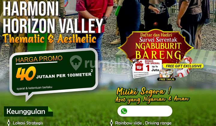 Tanah Kavling Murah Estetik Wisata Keluarga Bogor Timur Dekat Jakarta 60 Menit dari TOL Nagrak Cibubur Cileungsi Berada disekitar Hunian Besar dan Mewah seperti : Harvest, Rafles, Citra Grand, Metland Transyogi, Kota Wisata Cibubur, Citra Land Cibubur, Citra Indah, Bukit Golf, Grand Mekarsari, dll. Project ke-12 dari Harmoni Group Indonesia, konsep terbaru dgn pemandangan terindah dan teristimewa. Kavling Estetik dgn pemandangan alam yg luas membentang sejauh mata memandang di Bogor Timur. HARMONI HORIZON VALLEY Kawasan Kavling Estetik yg berada di ketinggian 400 MDPL berada di Puncak 2 Bogor Timur yg dikembangkan oleh Developer Terpercaya Harmoni Group Indonesia hingga project ke-12. Dibangun diatas Lahan 7,5 Ha menjadi primadona warga Jabodetabek karena lokasinya yg strategis dekat kawasan Puncak 2, tepatnya di Kec. Sukamakmur Kab. Bogor. Dengan konsep Modern & Estetik yaitu Kebun Tabebuya & CABIN CAPSULE yg Futuristik menciptakan kehidupan yg harmonis penuh warna, elegan dan selaras dgn alam menjadi tempat singgah yg nyaman dan menyenangkan. Dengan View Luas Lepas membentang pemandangan indah menawan perbukitan, persawahan, perkotaan, pedesaan dan city light view dimalam hari. Ditambah lokasi yg mudah terjangkau hanya 60 menit dari Exit Tol Nagrak Kota Wisata Cibubur dan 10 Menit dari Jalan Provinsi Transyogi, membuat Value tanah kavling ini menjadi berlipat dan Capital Gain/harga jual kembali yg tinggi, cocok buat Investasi masa depan yg menguntungkan. Dilengkapi dgn Infrastruktur seperti : One Gate System & pagar keliling, Musholla & Toilet, Jaringan Listrk, PJU, Drainase, Jalan Utama COR Beton 6,5 Meter, Jalan Antar Kavling COR Beton 5,5 Meter Memiliki Fasilitas Unggulan yg memanjakan seperti : - Driving Range Mini Golf - RAINBOW SLIDE - Kids Playground Harga Normal : 78 Juta/100 M2 SPECIAL PROMO MARET : 40 Juta/100 M2, sudah mendapatkan ; - Tanah Kavling ukuran 100M2 - Ukuran 8x12,5 - Bonus 1 Bibit Pohon Tabebuya - Bonus 1 Bibit PPohon Mangga - Include Biaya Surat-Surat Pajak & Notaris Nikmati perpaduan sempurna antara kemewahan, kenyamanan dan keindahan alam Hanya di Harmoni Horizon Valley. Segera Survei & dapatkan Unit Favoritnya. Ferry