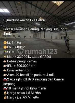 Disewakan gudang di parung panjang gunung sindur lt 1,1ha lb 5600m shm listrik 33000 KVA (ada gurdu) bisa limbah B3 ipl 500rb / bln bebas pungli akses 40 feet harga sewa 1,5M / th (min 3th) harga jual 65M (A20)