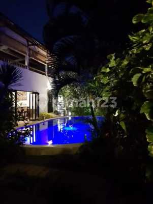 For sale villa with 4 private building second floor imb listrik 5500 swimming pool garden big acces road just 3 minute to beach with schoterr or car spesifikasi 3 building for business rentals daily, monthly and yearly every building have own -1 shower room - 1bedroom - living room and 1 building for - kitchen - play with billiard table Super interesting buying for business or private living