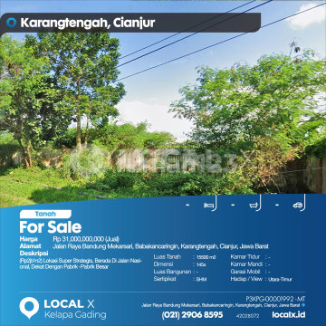 (Rp2jt/m2) Lokasi Super Strategis, Berada Di Jalan Nasional, Dekat Dengan Pabrik -Pabrik Besar For Sale - Jual Tanah Jalan Raya Bandung Mekarsari, Babakancaringin, Karangtengah, Cianjur, Jawa Barat Harga. Rp 31,000,000,000 (Jual) Deskripsi Properti. (Rp2jt/m2) Lokasi Super Strategis, Berada Di Jalan Nasional, Dekat Dengan Pabrik -Pabrik Besar Luas Tanah. 15500 m2 Dimensi. 145x Luas Bangunan. 15500 m2 Sertipikat. SHM Kamar Tidur. - Kamar Mandi. - Garasi Mobil. - Hadap / View. Utara-Timur LOCAL X Kelapa Gading ******** ⓪②① ②⑨⓪⑥ ⑧⑤⑨⑤ Whatsapp/Call. Mariana - ⓪⑧①⑥④⑧③⓪⑤⑤⓪ P3KPG-0000xxxx-MT-J
