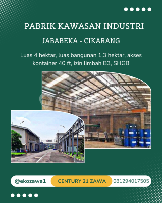 DIJUAL PABRIK DI KAWASAN INDUSTRI JABABEKA CIKARANG Lokasi : Cikarang - Jawa Barat Spec : • JUAL MURAH • Luas Tanah 40.010 m² || 4 Ha • Luas Bangunan 13.138 m² • Dimensi Tanah : 140 m² x 285 m² • Kotak Memanjang Simetris • SHGB sd tahun 2042 • Kawasan Dan Ijin Industri • Ijin Limbah B3 • Akses Jalan Depan Pabrik Lebar ( bisa 3 container ) - 1.7 Km ke Toll HARGA JUAL 4,4 Juta / m² - Exc PPN HARGA JUAL 176 MILYAR - Exc PPN Terima Titip dan Jual Beli Property Seluruh Indonesia KHUSUS PEMBELI SERIUS silakan hubungi: Eko Pakpahan 0812xxxxxxxx Century21 Zawa PIK #tanahdijual #tanahforsale #gudangdijual #gudangforsale #pabrikdijual #pabrikforsale #gudangpabrikforsale #mm2100 #kawasanindustri #kawasanindustrimm2100