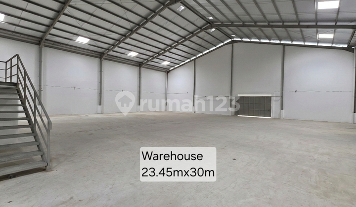 Disewakan Gudang Pabrik Baru Dalam Kawasan Industri Delta Silikon Lippo Cikarang Bekasi Spesifikasi: - Bisa untuk gudang atau produksi - Tanpa Loading dock - Gudang dengan 2 pintu dikiri dan 2 pintu di kanan memudahkan kendaraan keluar masuk gudang. - Ukuran bukaan pintu lebar=4.70m tinggi=4.70m - Tinggi gudang tepi=6.50m tengah=9.50m - Listrik 16.5 Kva Cikarang Listrindo - Air bersih dari WTP Lippo Cikarang - Kantor 2 lantai, 4 Toilet - Halaman depan lebar 10m, belakang lebar 6m. - Pencahayaan skylight pada atap - Sirkulasi udara dengan 8 unit turbin ventilator - Bebas banjir