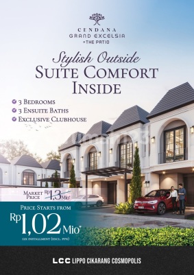 Cendana Excelsia Lippo Cikarang Berlokasi di di jantung kota Lippo Cikarang Cosmopolis terdapat fasilitas Clubhouse Eksklusif bagi penghuni. Keunggulan : 1. Lokasi Strategis dekat ke berbagai fasilitas di Lippo Cikarang : Dekat akses Tol, Mal, Sekolah anak, Pusat Kuliner, Sport Centre, Hotel, Rumah sakit, Pasar Modern dll 1.Infrastruktur Cendana Grand Excelsia underground (bawah tanah), seperti jaringan listrik, telepon, kabel TV & internet, dll 2.Fasilitas dalam cluster : Club House, Taman Bermain anak, Community Area, Reflexology, Pedestrian 3.One Gate system / Security 24 Jam 4.Tersedia Pilihan cara bayar : Cash, KPR, Installment 12 dan 24x