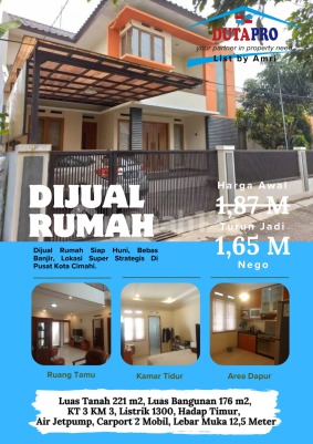 Bismillah.. Dijual Rumah Siap Huni Super Duper Strategis Di Tengah Kota Cimahi Luas Tanah 221 m Luas Bangunan 176 m Lebar Muka 12,5 m Bangunan 2 Lantai SHM IMB PBB Ruang Keluarga 1 Ruang Makan 1 Carport 2 mobil Kamar tidur 2 +1 Kamar Mandi 3 Dapur 1 Ada ruang cuci jemur dan ruang terbuka Listrik 1300 Air PDAM & Jetpump Harga 1,875 M Turun jadi 1,8 M Turun lagi jadi 1,65 M Selling Point: - dekat sekali alun-alun cimahi - dekat kilik dr. nur, RS Cibabat, RS dustira dll - dekat pusat perbelanjaan alfmart, indomaret, borma, superindo, ramayana dll - dekat tol baros dan tol padalarang - dekat pusat pendidikan SD SMP SMA SMK dll - dekat pemkot cimahi - dekat mcd sangkuriang - dekat pusat bisnis kota cimahi - dekat stasiun cimahi - dekat cimahi mall dll info lebih lanjut hubungi langsung Susi Aryanti Duta Property