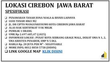 Investasi Emas di Jantung Kota Cirebon! Tanah Strategis di Pusat Niaga & Bisnis Jangan lewatkan kesempatan langka ini! Sebuah properti premium seluas 4865 M2 dengan Sertifikat Hak Milik (SHM) kini tersedia untuk Anda di lokasi paling prospektif di Cirebon. Terletak di Zona Pusat Niaga dan Bisnis (Commercial & Business District), tanah ini adalah jawaban untuk semua impian investasi dan pengembangan Anda. Mengapa Properti Ini Adalah Pilihan Terbaik Anda? Lokasi Super Strategis: Berada di jantung Kota Cirebon, properti ini menawarkan akses mudah ke berbagai fasilitas penting, pusat perbelanjaan, perkantoran, hotel, bank, dan destinasi populer lainnya. Potensi Pengembangan Tanpa Batas: Dengan luas lahan yang signifikan dan berada di zona komersial, properti ini sangat ideal untuk berbagai pengembangan seperti: Pusat Perbelanjaan Modern (Mall/Plaza) Hotel Berbintang Apartemen/Condotel Gedung Perkantoran Premium Pusat Konvensi/Pameran Rumah Sakit atau Fasilitas Kesehatan Unggulan Area Komersial Terpadu (Mixed-Use Development) Aksesibilitas Prima: Dikelilingi oleh infrastruktur jalan yang baik dan mudah dijangkau dari berbagai arah, memastikan kelancaran operasional bisnis Anda di masa depan. Nilai Investasi yang Terus Meningkat: Cirebon adalah kota yang berkembang pesat dengan potensi ekonomi yang kuat. Berinvestasi di lokasi pusat niaga akan memberikan keuntungan modal (capital gain) yang menjanjikan dalam jangka panjang. Legalitas Terjamin: Dengan status Sertifikat Hak Milik (SHM), proses transaksi akan berjalan aman, mudah, dan terpercaya. Bayangkan berbagai kemungkinan yang bisa Anda wujudkan di lokasi emas ini! Jadikan properti ini sebagai fondasi kesuksesan bisnis dan investasi Anda. Jangan tunda lagi, properti di lokasi seperti ini sangat dicari dan cepat laku! Hubungi Kami Sekarang untuk Informasi Lebih Lanjut dan Jadwalkan Survei Lokasi! More Info, Didin 08128850xxxx