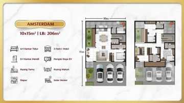 Dilengkapi Supermarket, Clubhouse, Swimming Pool, Lapangan Padel, Sekolah & Klinik Lebar 6, 8 & 10 Spesifikasi Rumah: Ukuran 10 x 15 m2 LB: 206 m2 4 + 1 KT & 5 + 1 KM Ruang Tamu & Ruang Makan Dapur Solar Heater Pengisi Daya EV 2 Parkir Mobil
