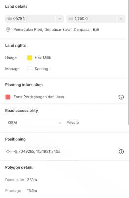 Dijual Tanah Eksklusif Kawasan Jalur Bisnis di Imam Bonjol Lokasi: Jl. Imam Bonjol, Denpasar Barat, Denpasar, Bali Harga global hanya 12 M, nego halus Tanah ada (bangunan kantor kecil) Luas tanah 1250 m2/12.5 are Lebar depan 14 meter Panjang 100 meter Tanah datar siap bangun Jalan utama Hadap timur SHM Aspek perumahan (itr perdagangan & jasa) Cocok untuk perumahan/showroom/kantor/bengkel, dll Lokasi dekat ke Seminyak/Kuta/Denpasar Berjarak hanya 200 meter dari transmall & depan hotel/dekat Sunset Road 15 menit ke Seminyak 26 menit ke Pantai Jimbaran 21 menit ke Pantai Kuta 28 menit ke Bandara Ngurah Rai 45 menit ke Pantai Nusa Dua 47 menit ke Sanur 1 jam 4 menit ke Canggu 1 jam 38 menit ke Ubud