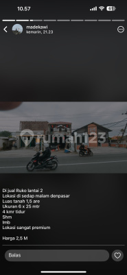 Ruko di jual jl utama sedap malam dentim dekat Sanur renon tanah 1.5 are harga 2.5 M 4 kamar tidur 2 lantai shm pbb dko Md kawi